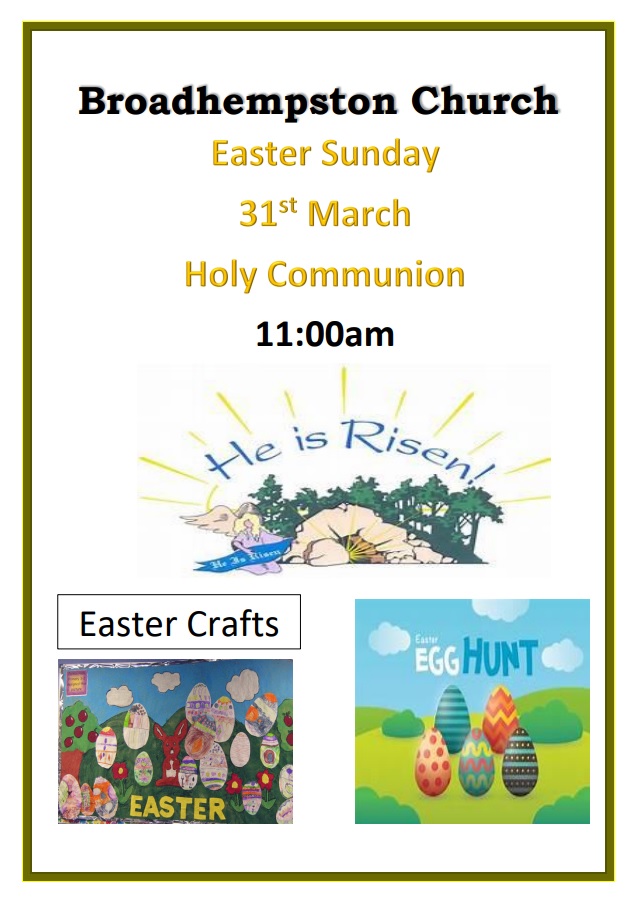 10am St Mary’s Denbury Holy Communion followed at 11.30am by Easter Bonnet parade and Easter egg hunt.